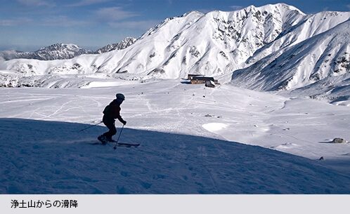 当日はお天気に恵まれ、北アルプスの雄大な景色を楽しんだだけではなく、すでに雪がたっぷりと積もっていて、立山連峰に連なる浄土山の斜面を持参したスキーで滑ることができ、大満足の山旅となりました。